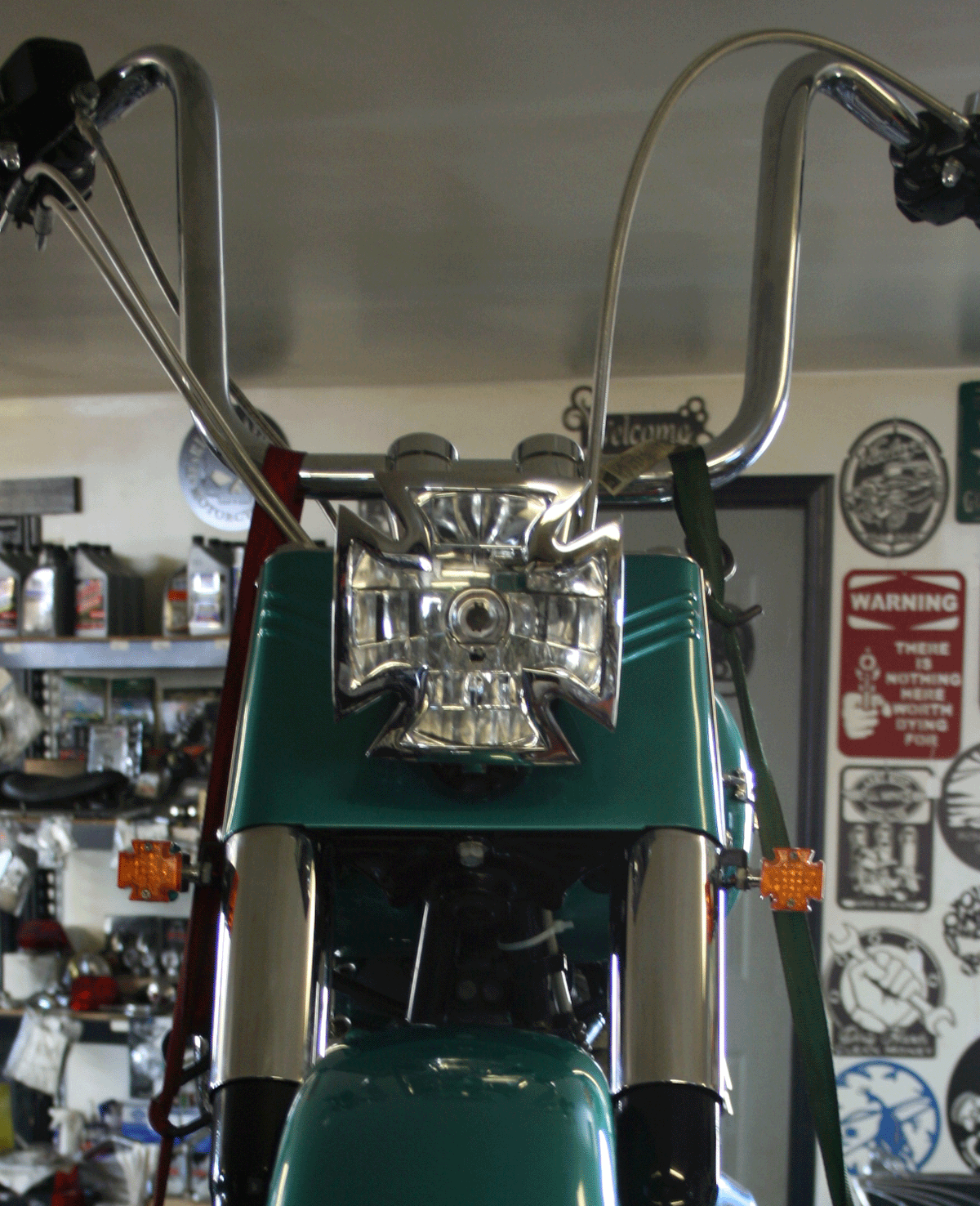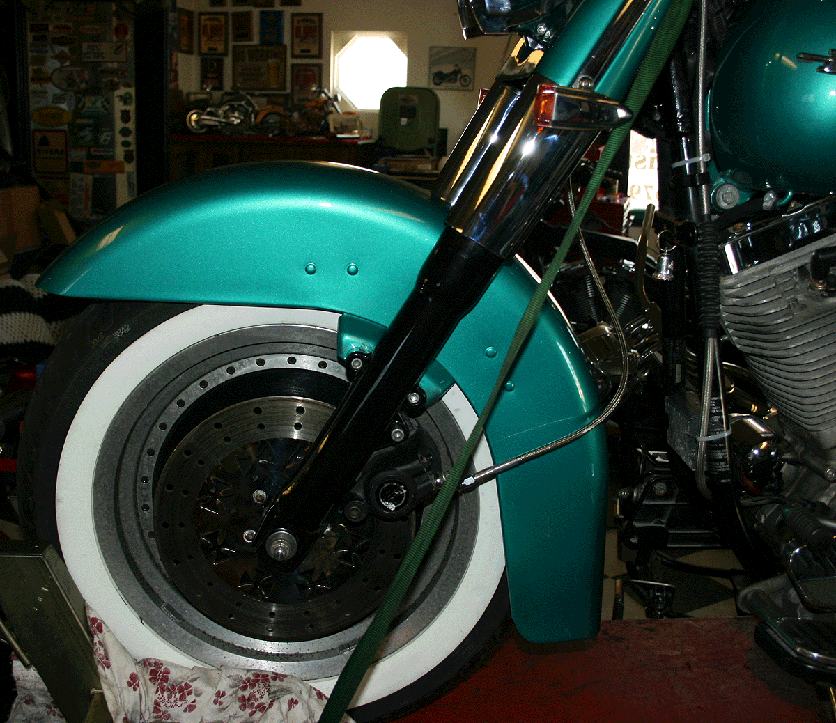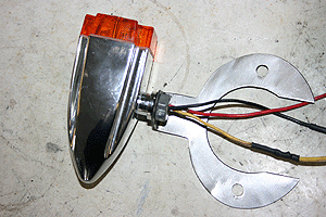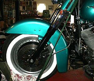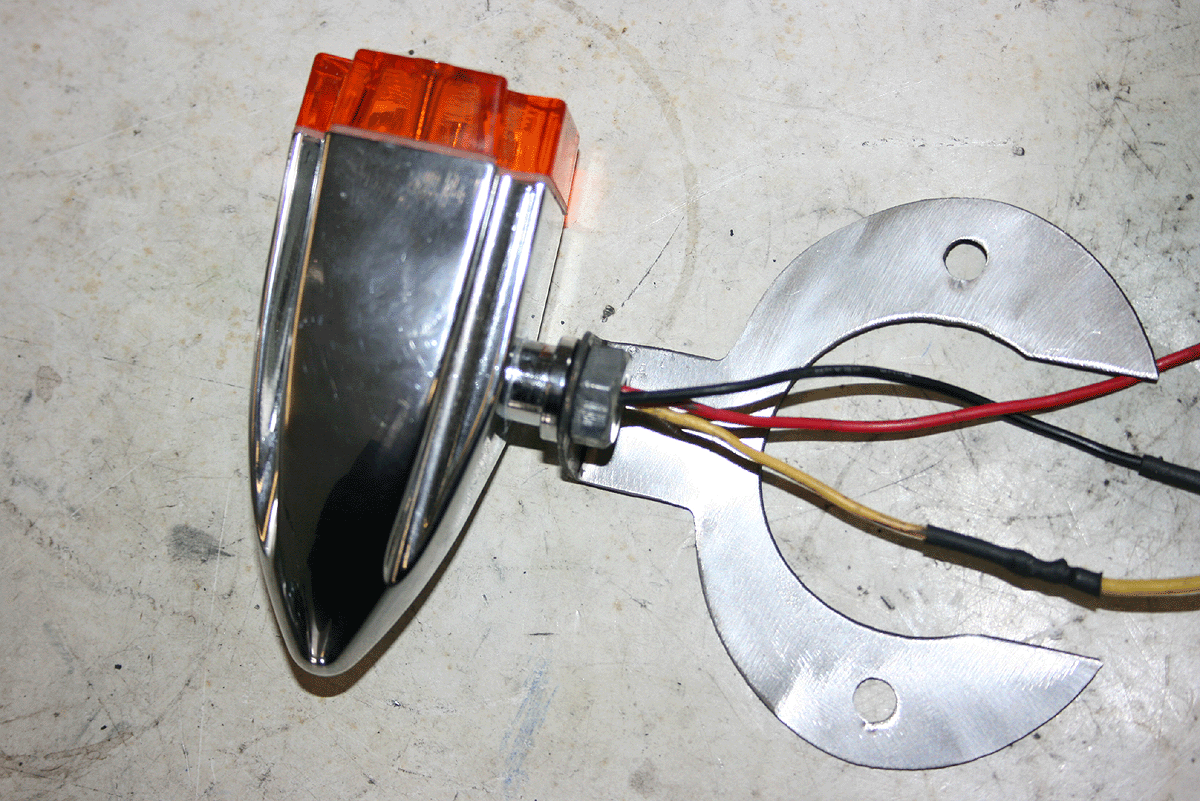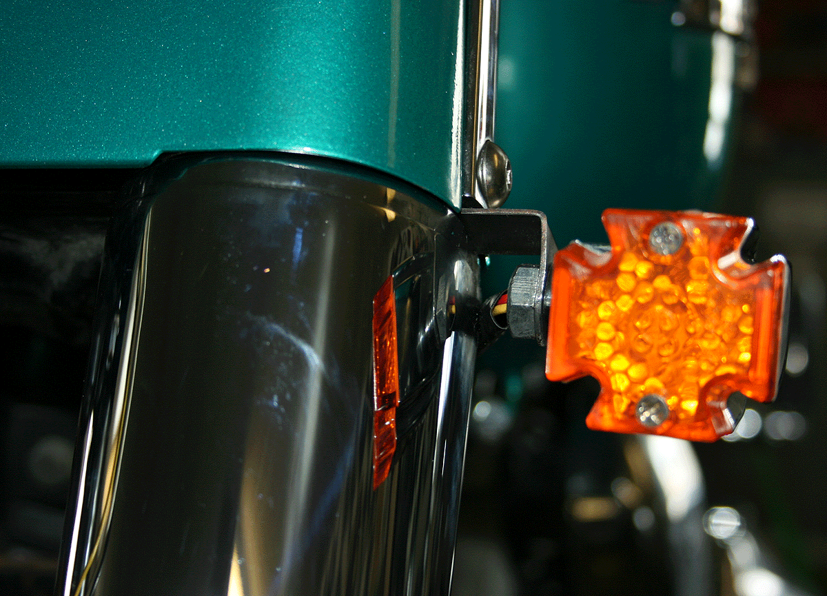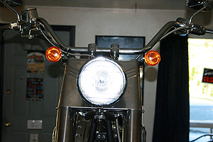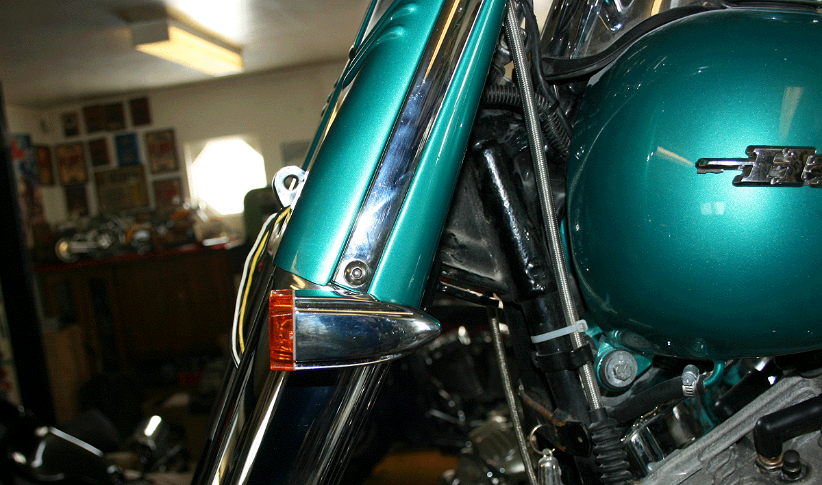 Over the years it has been an on going problem of how and where to mount custom signal on wide glide front ends. The Tin Shrouded types presenting the biggest problems. Usually they have a large bar that supports the driving lights and the signals. But many riders like the shroud style but do not want the big bar and lights. And so begins their problems. Also getting them mounted so they do no hit the gas tanks made it even harder.