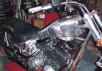 WE HAVE JUNKED THE STANDARD FATBOB TANK AND DECIDED TO MAKE A STRECHED KING SPORSTER TANK ON IT FOR THAT CHOPPER LOOK. IT TAKES SOME TIME TO CONSTRUCT THE DESIRED TYPE OF STRETCH THAT YOU WANT BUT I AM SURE THAT THIS WILL COMPLIMENT THE STYLE OF THE BIKE MUCH BETTER.