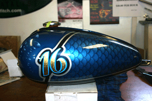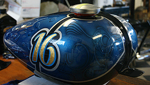 Mutiple panel of different designs that will take you back to that time frame. The number 16 is laid in with Gold Leaf and has its own special look on the tank. Sweet...