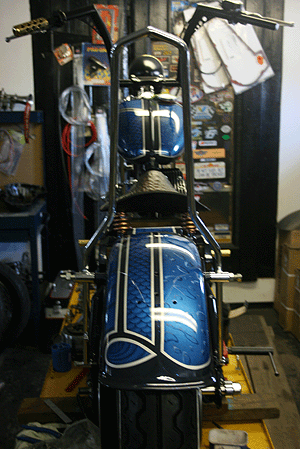 Well Zeke came by today with some goodies for me. Finally the paint is here and I love it. It is definatly a flash back to the 70's! Once again he has come through with just the type of thing I was looking for. Everything outlined in a silver pin stripe to set it apart in its own panels, yet keeping the dark blue background consistant through out the bike.