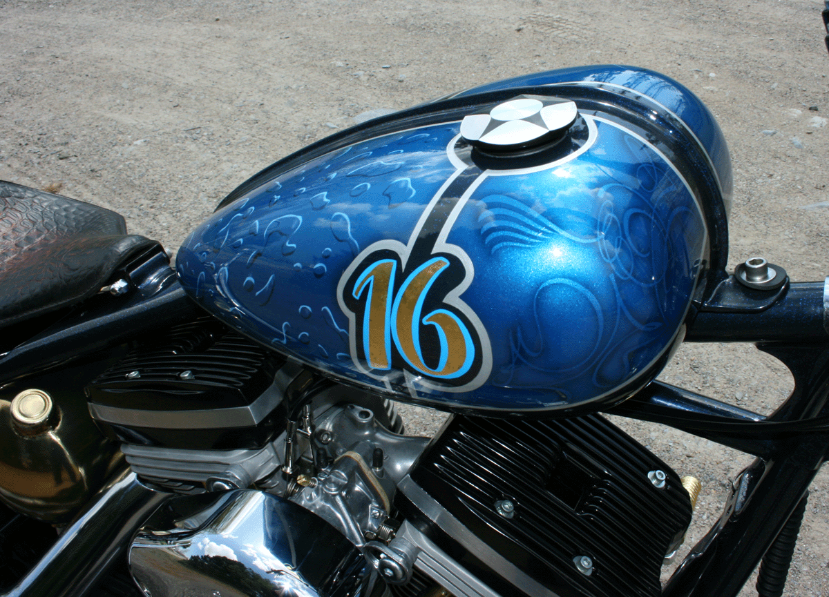 I love the way the gas tank is done. Zeke is pretty crafty and I think he captured the feel of a 70's chopper with this paint job.