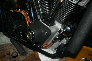 Rick was certian that he wanted the polished look for the inner and outer primary covers. Regulator mount is on as is the oil filter housing and S&S Black oil filter to break things up.
